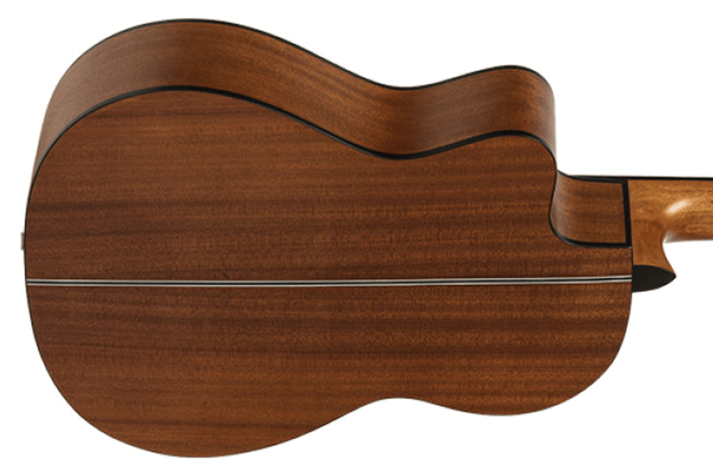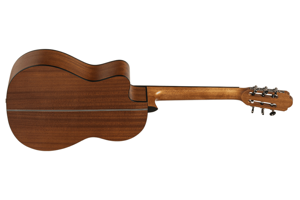 The Angel Lopez Graciano CM-CE offers a rich, warm tone thanks to its solid cedar top and sapelli back and sides. This acoustic-electric classical guitar features a genuine rosewood fingerboard and a bone nut for superior resonance. Additionally, the satin finish allows the wood to breathe and vibrate naturally. Players will appreciate the rounded end frets that ensure a smooth playing experience during long sessions.