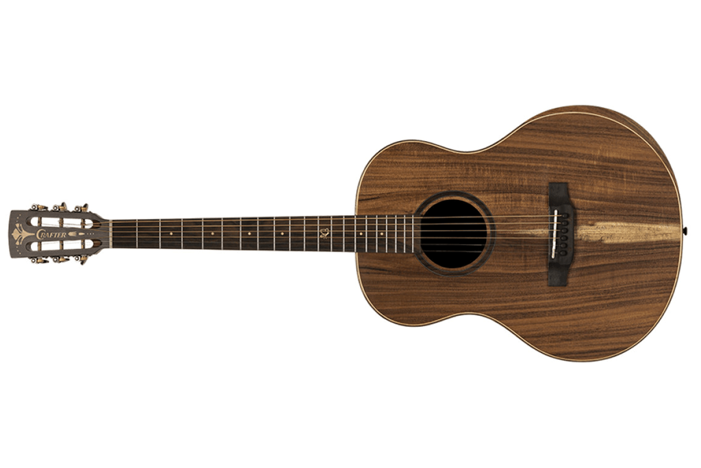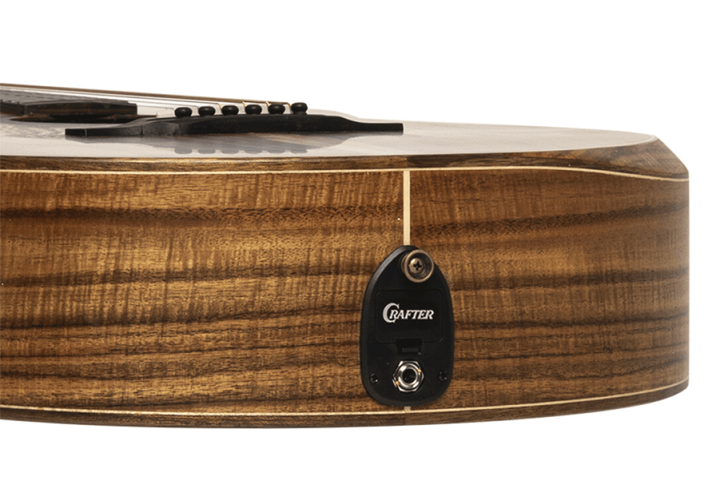 Crafter integrates an innovative armrest with spruce purfling into the Koa body binding to ensure your playing arm remains comfortable during long sessions. Additionally, the mahogany neck and rosewood fingerboard provide a smooth, responsive feel across the 25.5-inch scale. Since the 12th fret showcases a beautiful butterfly inlay and the headstock features a classic slotted design, this instrument looks just as stunning as it sounds.