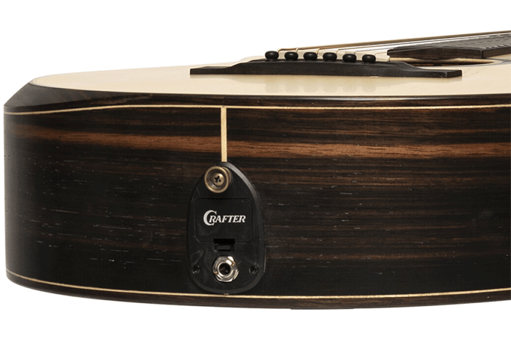 The Crafter Mino Macass Acoustic-Electric Guitar features a solid Engelmann spruce top that delivers a bright, responsive tone for every player. Because this model pairs the spruce top with Macassar back and sides, you will enjoy a rich visual aesthetic alongside a warm, punchy sound profile.