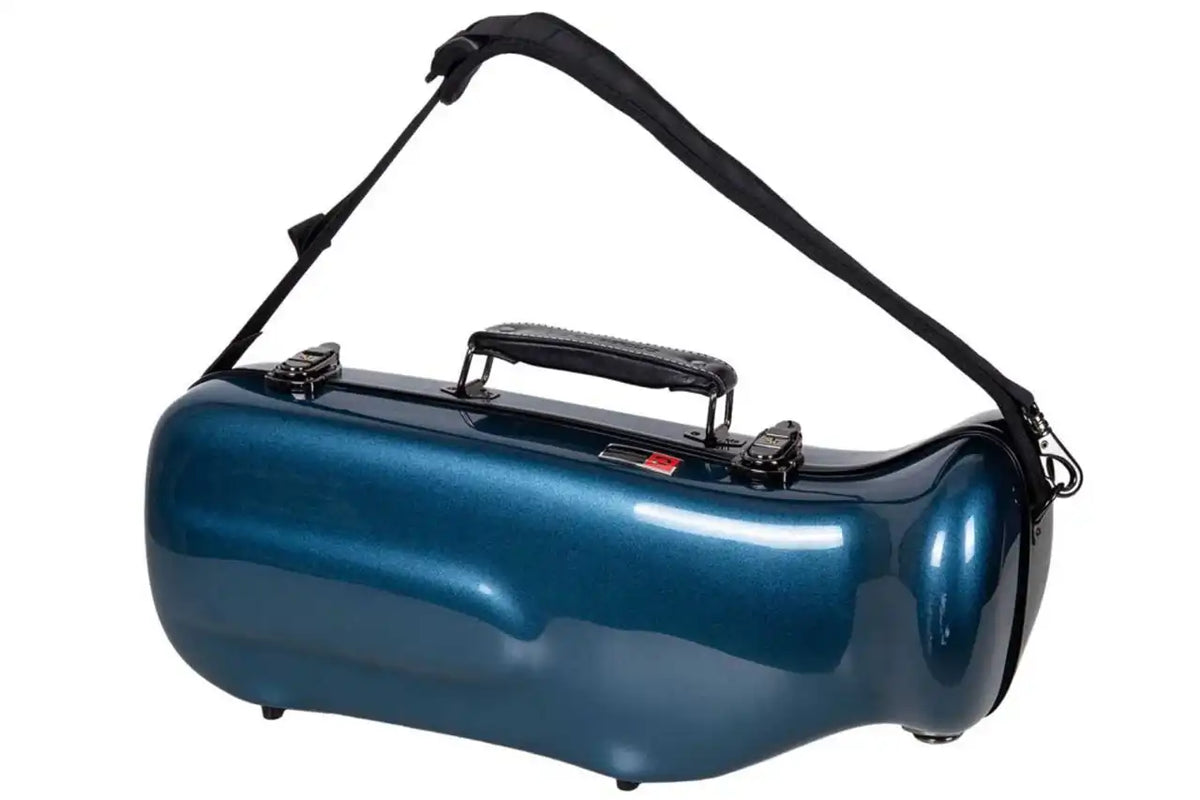 Crafted from durable fiberglass and adorned in striking blue, this case is tailored for Bb trumpets. Ensuring security during travel, it boasts three latches, including an alloy TSA lock. Enjoy comfort with options for single shoulder or backpack carrying.