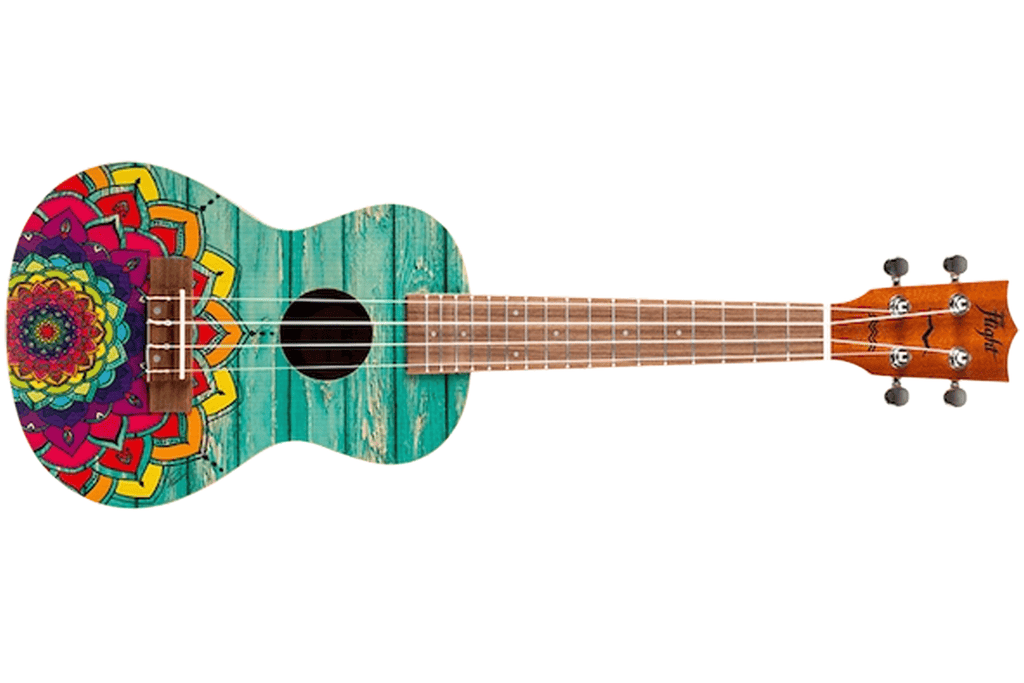 The Flight AUC-33 Mansion Concert Ukulele brings a vibrant summer vibe to your playing experience from the very first strum. Designed by artist Reham Fareed, this model features lively colors and a teal wood pattern that instantly evokes beaches, sunshine, and surf culture. Because the instrument blends fun aesthetics with practical playability, it’s perfect for musicians who want their ukulele to stand out visually while still delivering warm, reliable tone.