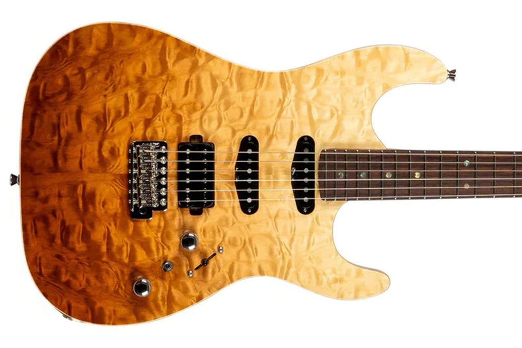 To clarify, the Jet JS-45 Fireburst Electric Guitar features HSS Alnico custom set pickups with a 3-way switch, 1V 1T controls, and one mini switch, offering flexible tonal shaping. In addition, the Wilkinson WV6SB bridge works with locking tuners, therefore helping maintain tuning stability in standard E-A-D-G-B-E tuning.