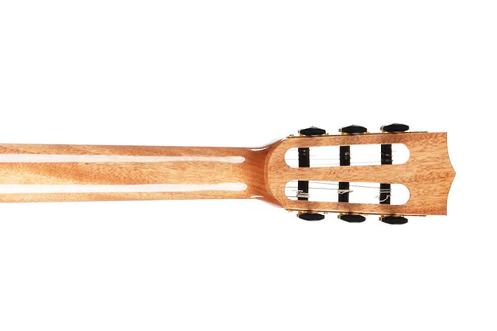 The Kala GTR-MTN-E Thinline Nylon Guitar combines elegant design and modern performance, offering players a lightweight instrument with a warm, resonant tone. Because it features a solid mahogany top paired with laminate mahogany back and sides, this thinline guitar produces a rich midrange and balanced projection that suits both fingerstyle and light strumming.