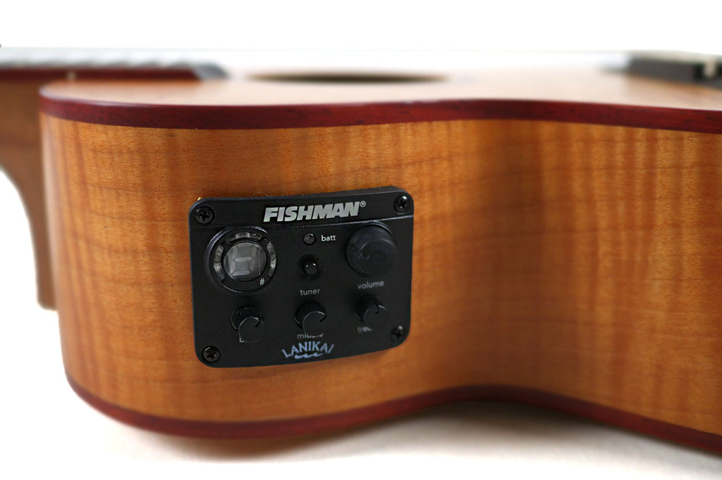 The Lanikai FM-5CET 5-String Tenor Ukulele is versatile because it features both high and low G tuning, so musicians can expand their tonal range with ease. During live performances or practice, the Fishman Kula Preamp with onboard tuner offers precise control, and then the open-geared tuners keep the D’Addario Nyltech strings stable.