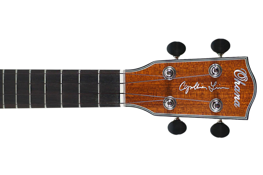 The Ohana CK-14-CL Cynthia Lin Concert Ukulele delivers a balanced concert-size feel and immediately showcases its Cynthia Lin signature headstock for visual distinction. Built with a mahogany laminate top, back, and sides, this ukulele offers a warm, focused response because the satin finish allows the instrument to resonate freely.