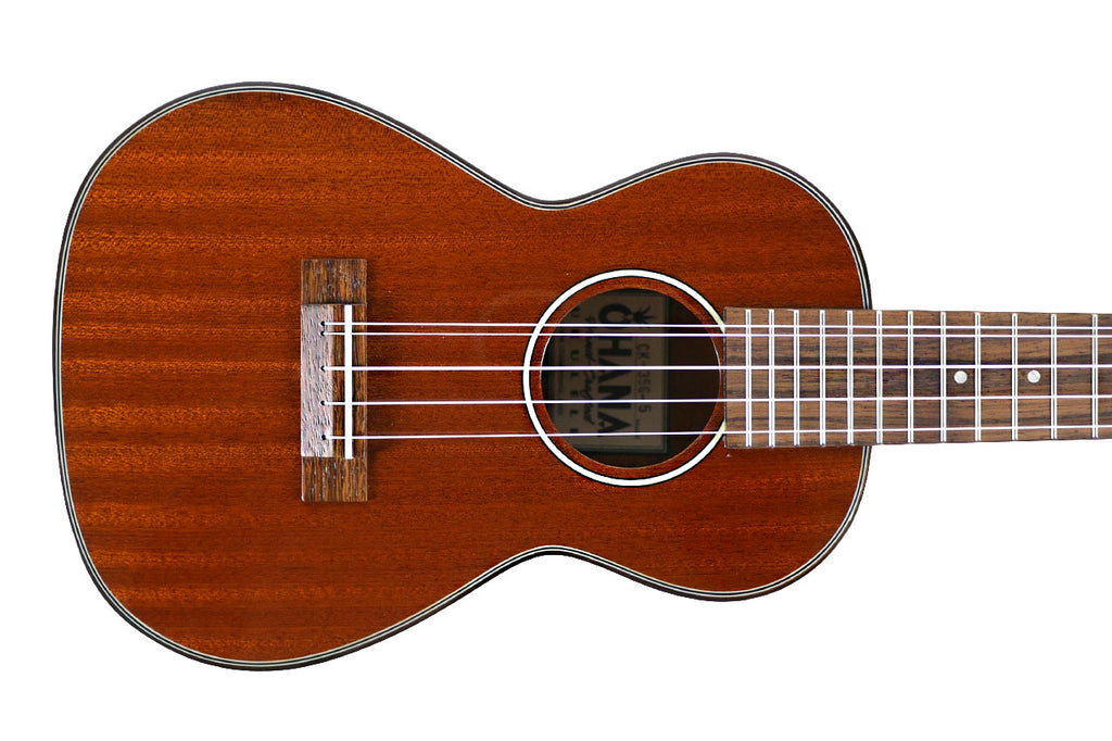 The Ohana CK-35G-5 5-String Concert Ukulele delivers a refined playing experience above all by combining a solid mahogany top with solid mahogany back and sides in a glossy finish. The mahogany neck paired with a hardwood fretboard and bridge creates a balanced feel, in fact offering smooth playability across all 19 frets.