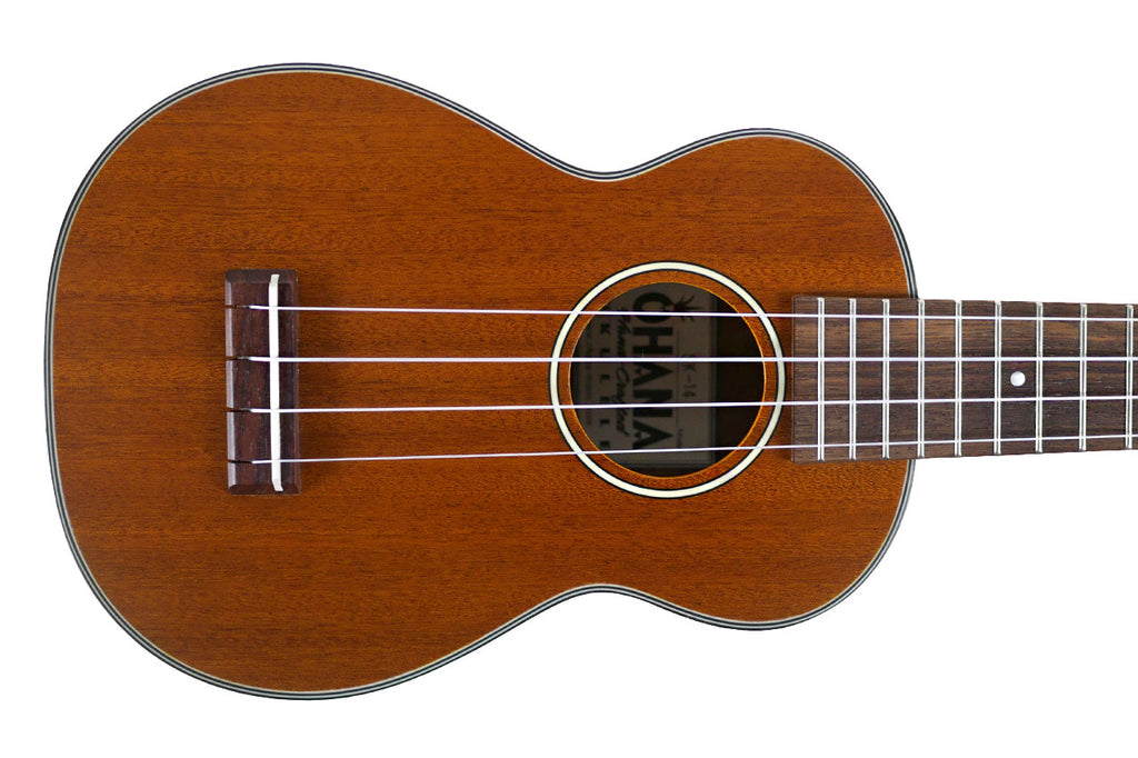 The Ohana SK-14 Soprano Ukulele is a compact and reliable instrument that delivers warm tone and traditional charm, and it is crafted with a laminate mahogany top, back, and sides that ensure both durability and resonance. Because the satin finish enhances its natural wood grain, this soprano ukulele looks refined while remaining comfortable to hold during long practice sessions.