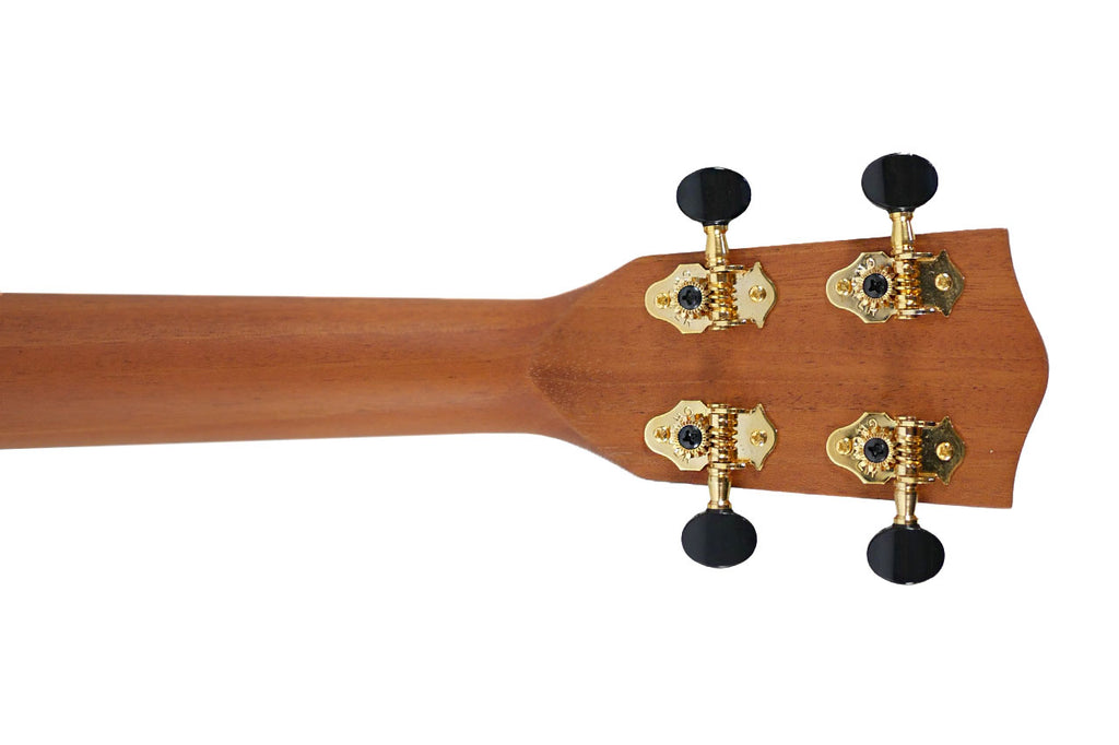 Furthermore, the ebony fretboard and bridge provide exceptional durability and smooth playability, while the bone nut and saddle ensure accurate intonation. Given that it features rope marquetry rosette detailing, this ukulele stands out visually and sonically. In fact, its D-G-B-E tuning produces a warm, guitar-like range that appeals to both guitarists and ukulele players. Compared to entry-level instruments, its solid-wood construction delivers superior projection and sustain.