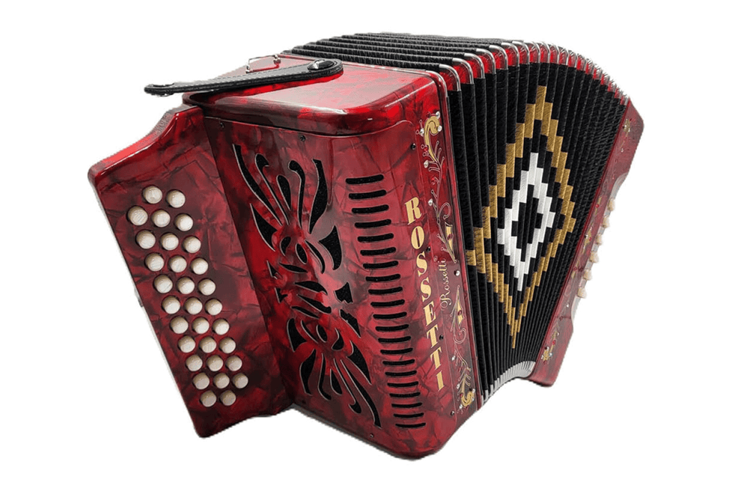 The Rossetti 3112-FBE-RD 31 Button Accordion offers a premium playing experience for musicians who value both style and precision. Featuring a diatonic setup in the popular key of FBE, this instrument provides 31 treble buttons across three rows and 12 bass buttons for a rich, full-bodied sound.