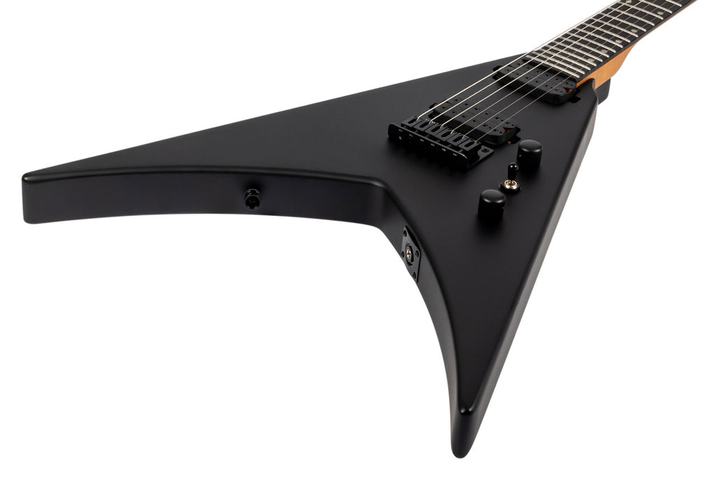 The Spira V-400 MBK Black Flying V Electric Guitar delivers a striking aesthetic and confident feel, above allappealing to players who want a modern edge. The Flying V body is crafted from roasted poplar with a satin black finish, and this combination keeps the instrument lightweight and comfortable.