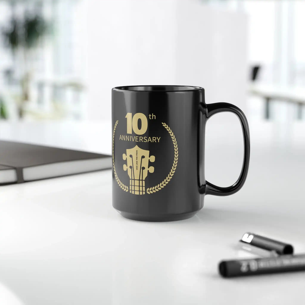 Designed for everyday use, the Uke Like The Pros 10th Anniversary Mug features a sleek black, glossy ceramic finish with vibrant, long-lasting prints. Moreover, its 15 oz capacity is perfect for coffee, tea, or late-night practice fuel.