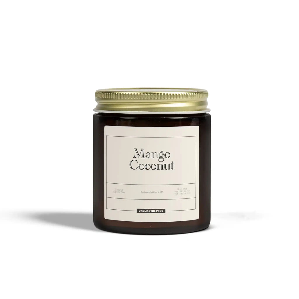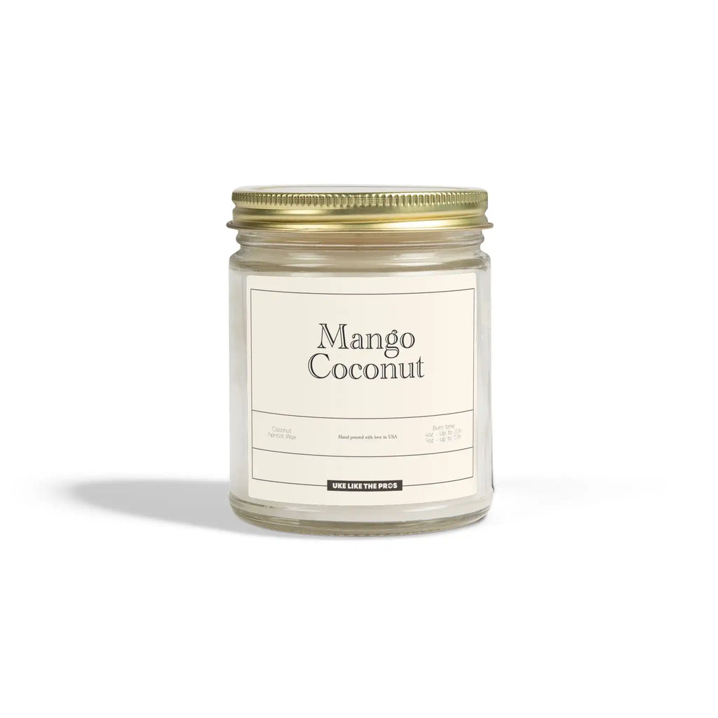 The Uke Like The Pros Coconut & Apricot Wax Scented Candle brings a refreshing Mango Coconut aroma directly into your favorite practice space. Because this candle features a premium blend of coconut and apricot wax, you will enjoy a cleaner and more sustainable burn compared to traditional paraffin.