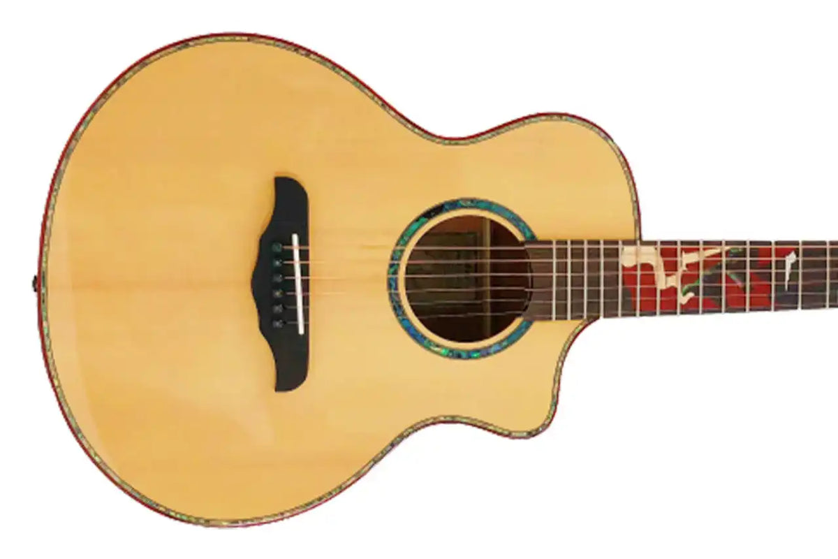 To clarify, the 5-piece neck paired with bone nut and saddle ensures long-lasting stability and resonance. Compared to other models, this mini grand auditorium shape is comfortable for extended playing sessions and then provides excellent projection. Furthermore, the creek-themed fretboard inlay highlights its unique character, and the custom die-cast tuners keep your sound precise.