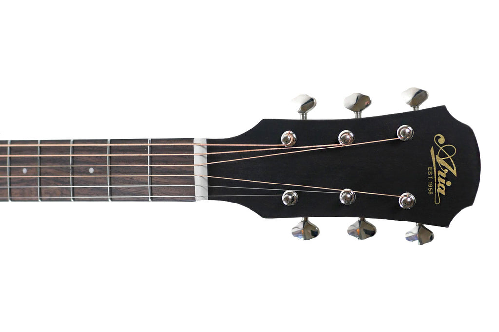 The Aria 131UP-STBK Stained Black Parlor Guitar also features 20 frets that deliver versatility across genres, and chrome tuners that hold tuning stability even during extended practice. Above all, the bone nut and saddle enhance resonance because they transfer string vibration with clarity and precision.