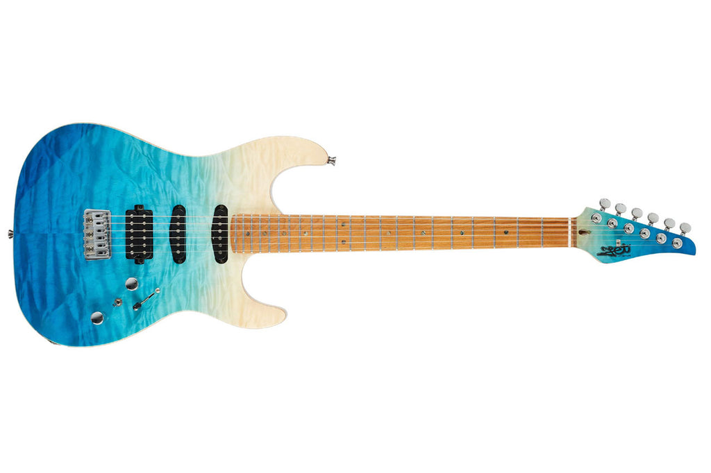 Jet JS-1000 QTBL Quilted Blue Stratocaster Electric Guitar delivers a striking look with its Quilted Transparent Blue top, and it also provides comfortable playability because the 25.5" scale length, 1.65" nut width, and 9.5" fretboard radius suit a wide range of styles. The mahogany body pairs with the roasted maple neck and fretboard, and then the Modern C shape ensures a smooth, familiar hand fit.