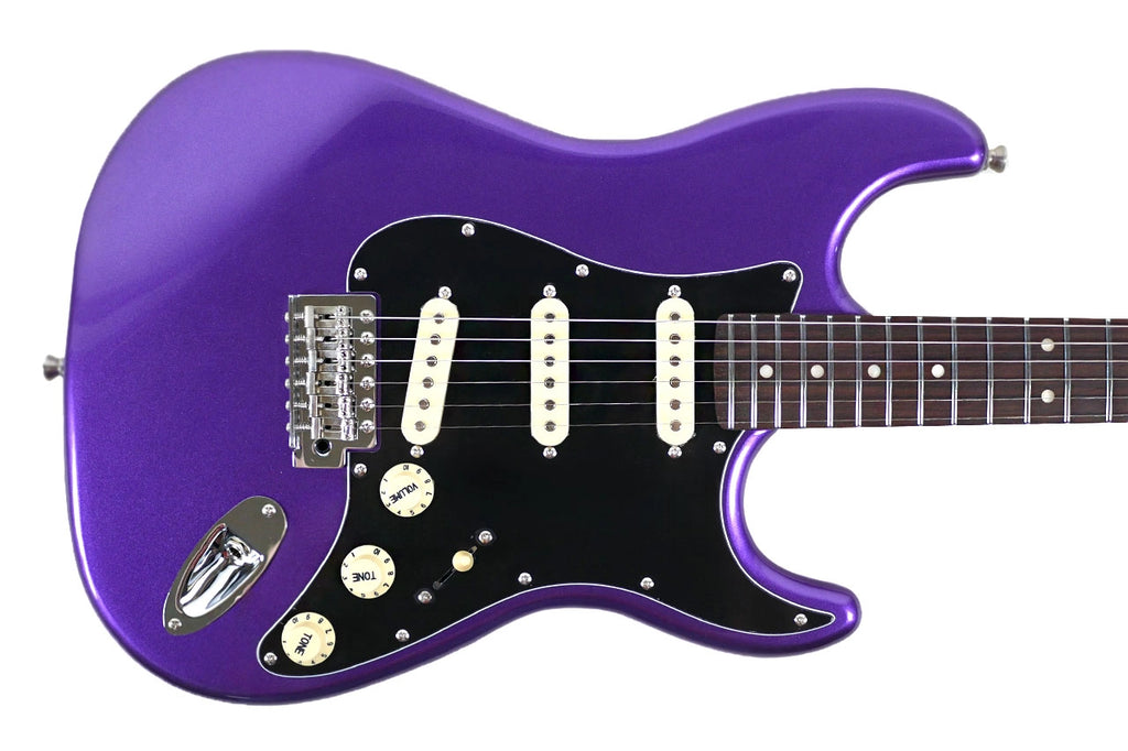 The Jet JS-300 Plum Stratocaster Electric Guitar features an SSS ceramic pickup configuration, furthermore providing clear tones suited for various genres. Its 1 volume and 2 tone controls work with a 5-way switch, to clarify allowing precise sound shaping during performance. Chrome tuners offer dependable tuning stability, and then they complement the sleek overall look.