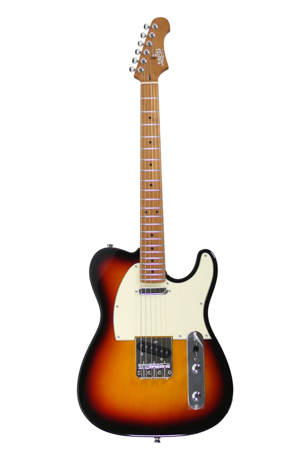 The Jet JT-300 SB Sunburst Telecaster Electric Guitar delivers a smooth playing experience because its basswood body, roasted maple neck, and roasted maple fretboard combine for balanced tone and dependable comfort, and it also features a Modern C neck shape that players appreciate.
