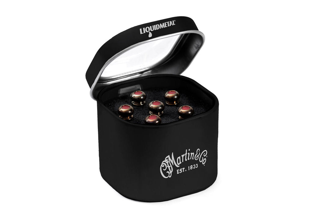 Crafted with precision, the Martin Luxe Red Gold Bridge Pin Set includes six pins featuring radiant gold and red dot inlays. Moreover, made from Liquidmetal® and Zirconium alloy, these pins reflect energy for enhanced volume and extended sustain.