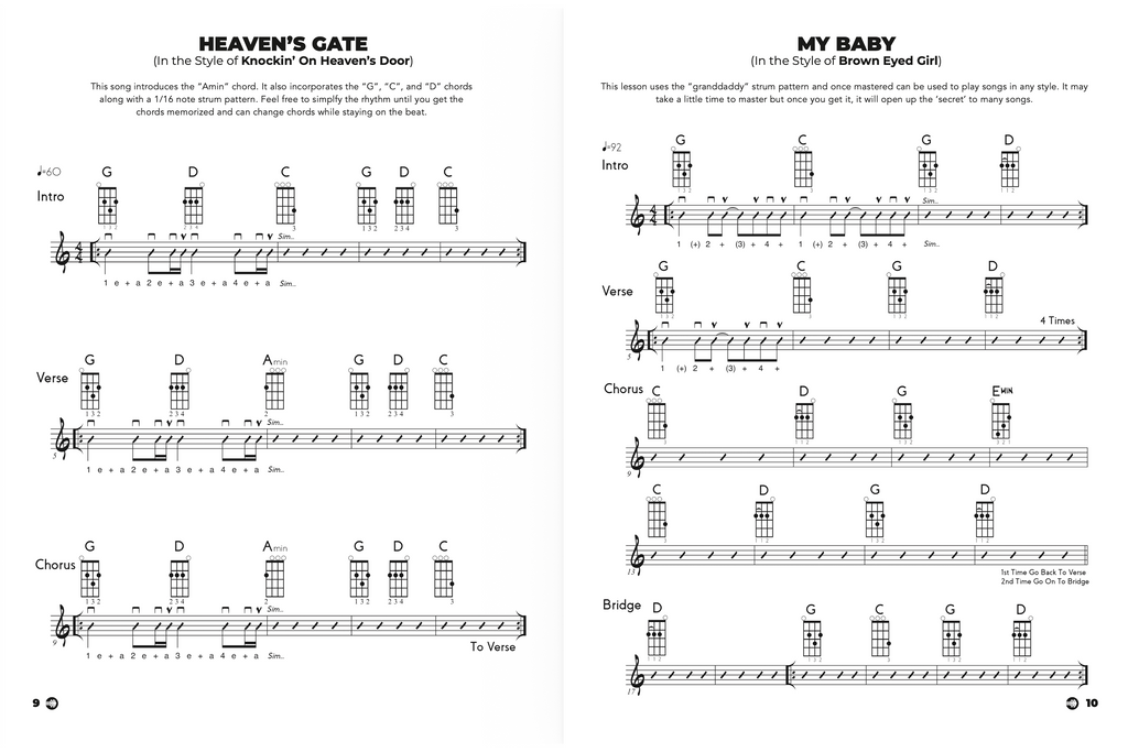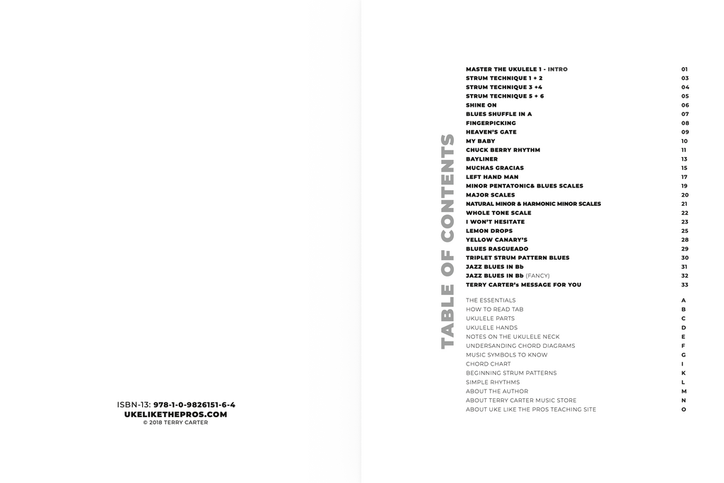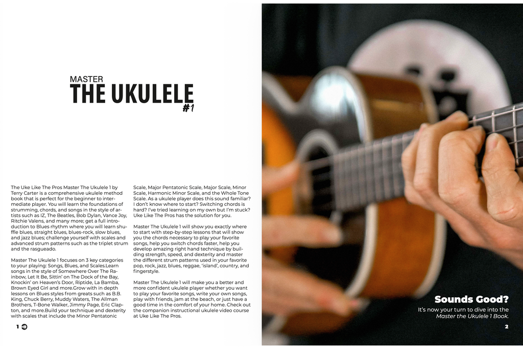 The Uke The Pros Master The Ukulele 1 by Terry Carter is a comprehensive ukulele method book that is perfect for the beginner to intermediate player. You will learn the foundations of strumming, chords, and songs in the style of artists such as IZ, The Beatles, Bob Dylan, Vance Joy and many more; get a full introduction to Blues rhythm where you will learn shuffle blues, straight blues, blues-rock, slow blues, and jazz blues; challenge yourself with scales and advanced strum patterns such as the triplet strum and the rasgueado. As a ukulele player does this sound familiar? I don't know where to start? Switching chords is hard? I've tried learning on my own but I'm stuck? Uke Like The Pros has the solution for you. Master The Ukulele 1 will show you exactly where to start with step-by-step lessons that will show you the chords necessary to play your favorite songs, help you switch chords faster, help you develop amazing right hand technique by building strength, speed, and dexterity and master the different strum patterns used in your favorite pop, rock, jazz, blues, reggae, 'island', country, and fingerstyle. Master The Ukulele 1 will make you a better and more confident ukulele player whether you want to play your favorite songs, write your own songs, play with friends, jam at the beach, or just have a good time in the comfort of your home.