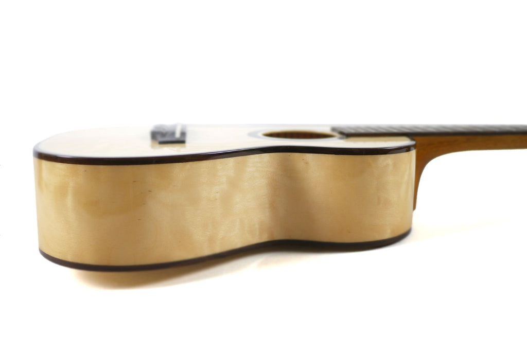Above all, players will appreciate the abalone and wood rosette, which adds a refined touch. To clarify, comfort and playability are prioritized with a hardwood fretboard featuring pearloid dot inlays on both the top and side for easy navigation during practice or performance. Certainly, the bone nut and saddle deliver stable resonance, and the Grover gold tuners with black buttons ensure precise tuning.