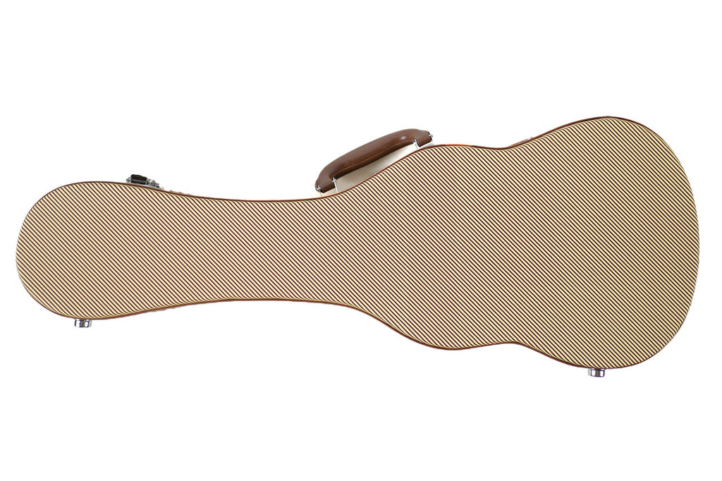 Chrome finished drawbolt latches ensure secure closure, while adding a polished touch to this classic case design. Not only that, the brown Tolex trim features sewn stitches and a matching handle for easy, elegant transport. Interior dimensions include a 24.87" overall length and 13" body length to fit standard concert sizes. The upper and lower bout widths are 6.5” and 8.5” respectively, with a 4” compartment depth when closed. Headstock width measures 4.25”, offering a snug fit for most concert ukulele headstocks. Therefore, this case is an ideal blend of vintage charm, secure structure, and functional design for ukulele players.