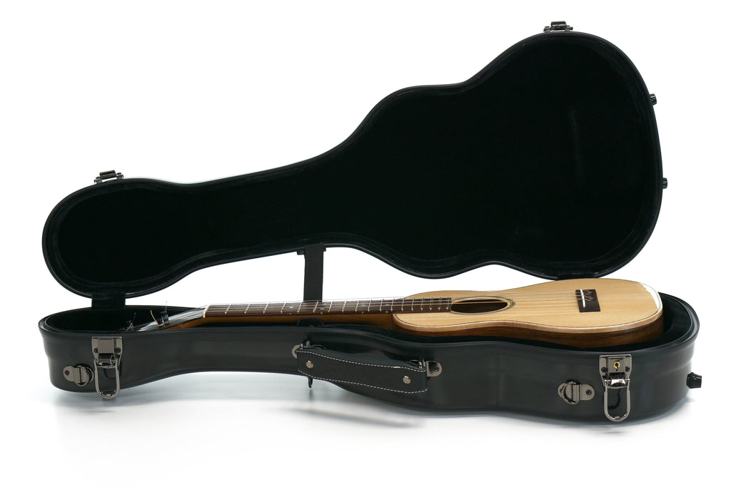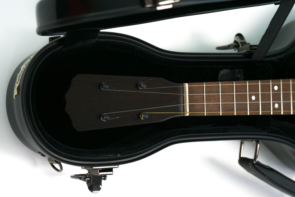 This ukulele has solid Moon Spruce top, Brazilian Rosewood sides/back fretboard, bridge, and headplate, Flamed Maple binding, Wittner geared violin style tuners, wood Rosette and Purfling, and Pepe's French Polish.