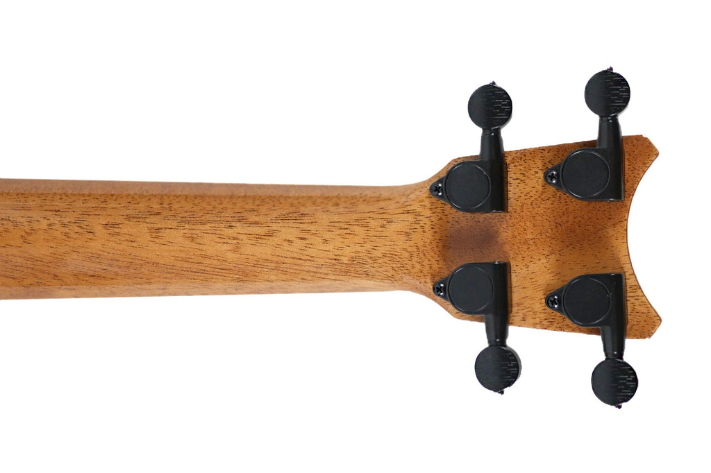 In fact, its compact 18.5" overall length and 7" width make it easy to travel with, but the 1.41" nut width ensures comfortable playability. Furthermore, the mahogany neck paired with an ebony fretboard and bridge provides smooth action and durability, while bone nut and saddle components enhance clarity and sustain. Chrome tuners with black buttons enhance precision and style, while Romero US2 strings (G-C-E-A, low G) complete the tone.
