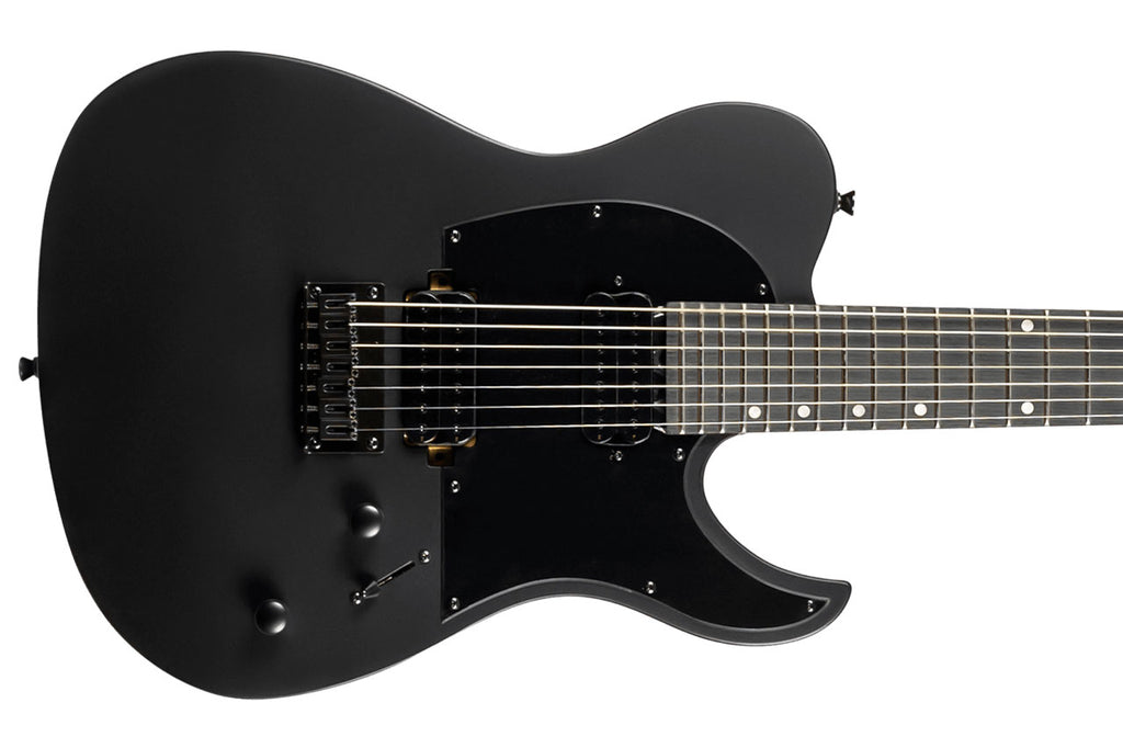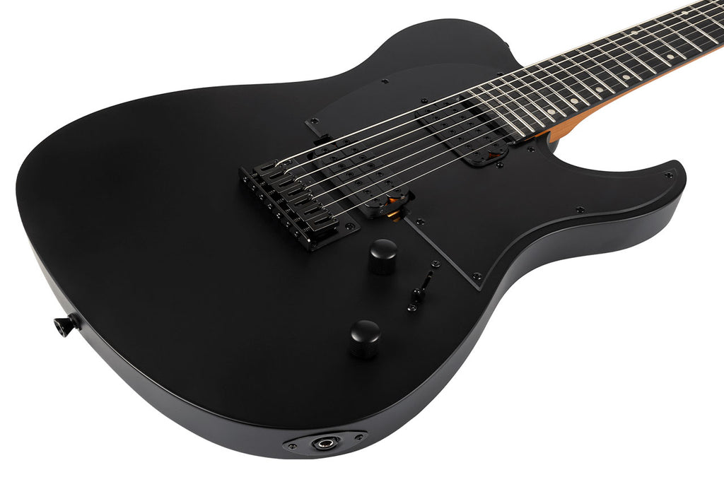 The Spira T-407 MBK T-Style 7-String Electric Guitar delivers a bold mix of tone and playability, and it certainly stands out with its roasted poplar solid body in sleek satin black. Because this guitar features a 26.5" scale length, 24 frets, and a hi graded ebony tech fretboard, players gain extended range and smooth articulation for heavy or complex styles.
