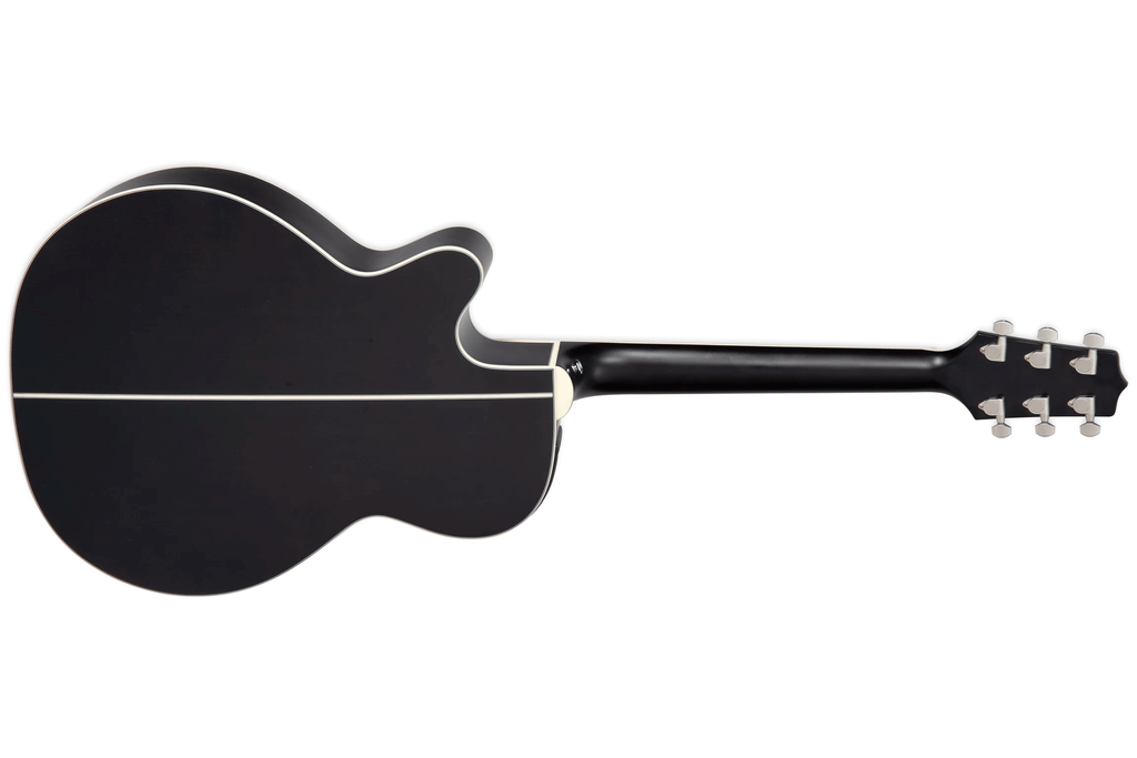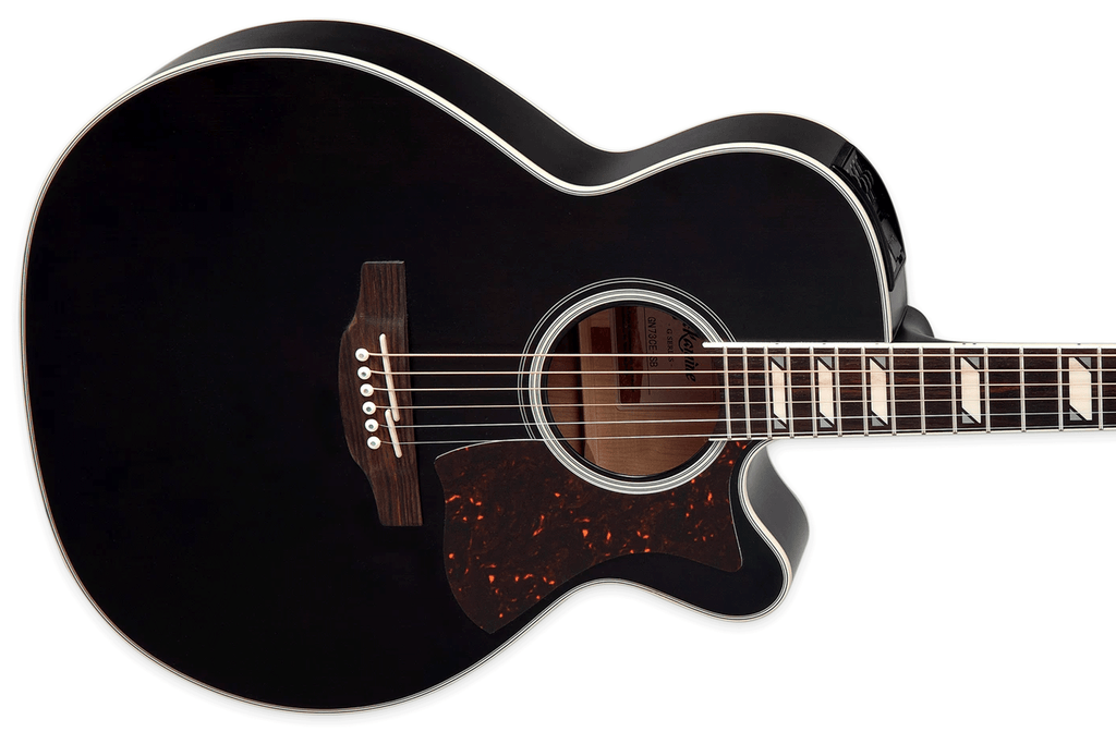 The Takamine GN73CE Acoustic-Electric Guitar stands out as a retro-inspired, satin black powerhouse that feels at home on a rock stage or in an intimate acoustic setting. Because it features a solid spruce top paired with maple back and sides, this instrument delivers a bold sound that projects with impressive authority.