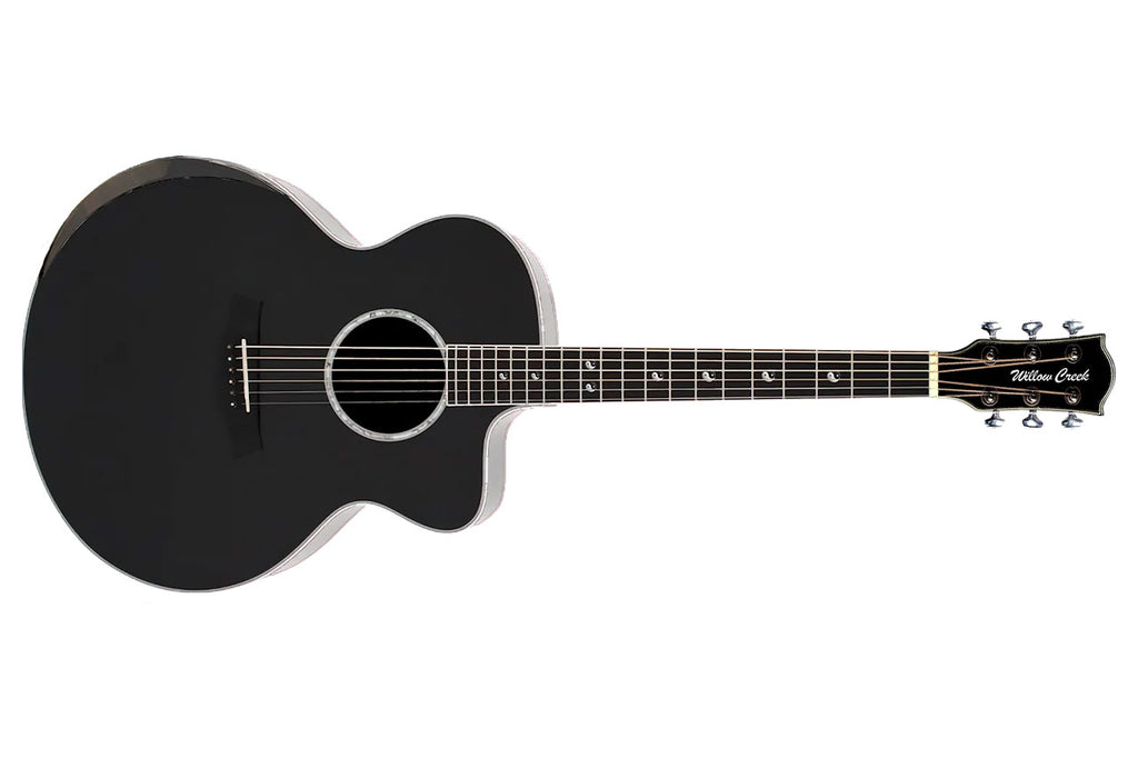 The Willow Creek FX-PJ95 Acoustic Jumbo Pro Guitar delivers an outstanding blend of artistry and performance, and it instantly stands out because of its striking translucent black finish. Firstly, the jumbo size enhances projection and tonal depth, and then the solid Sitka spruce top adds balanced clarity that players truly appreciate.